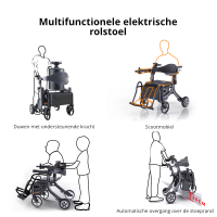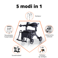 De elektrische rolstoel 9000SW is uniek dankzij zijn 5 functies. De Eroute 9000SW kan worden gebruikt als rollator, rollator met wielen, rolstoel, mobiele scooter of revalidatieassistent.