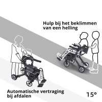 De rolstoel kan worden ingesteld op de modus revalidatieassistent. Op dat moment ontwikkelt de rollator weerstand, wat voor senioren gunstig is voor het uitvoeren van revalidatieoefeningen. De verstelbare, brede, zachte, ergonomische armleuningen ontlasten uw wervelkolom. Het comfortabele en brede zitvlak van hoogwaardig schuim en de schokdempers voor en achter zorgen voor comfort op elk terrein. Bovendien heeft het een anti-valfunctie. Als u plotseling uw evenwicht verliest en dreigt voorover te vallen, blokkeert het systeem het rollator door automatische detectie, zodat de rollator niet meer vooruit kan bewegen en uw veiligheid wordt gewaarborgd.