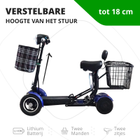 Deze kleine, compacte en krachtige scooter past in de auto, de lift en uw appartement en heeft een groot bereik van maximaal 30 km en kwaliteitsremmen waarop u volledig kunt vertrouwen. Een groot voordeel is dat u geen rijbewijs of registratie nodig hebt om ermee te rijden. De elektrische scooter produceert geen uitstoot en vervuilt de lucht niet. De elektrische scooter is dus een goedkoop en milieuvriendelijk vervoermiddel. U kunt hem gebruiken voor uitstapjes in de omgeving, om naar uw werk of school te rijden, om boodschappen te doen en voor diverse andere klusjes. De hoogwaardige lithiumbatterij gaat bij correct gebruik 5 tot 6 jaar mee. De scooter is voorzien van een voormand, achtermand, voorlicht, informatiepaneel, comfortabel zadel, armsteunen, oplader en batterij.